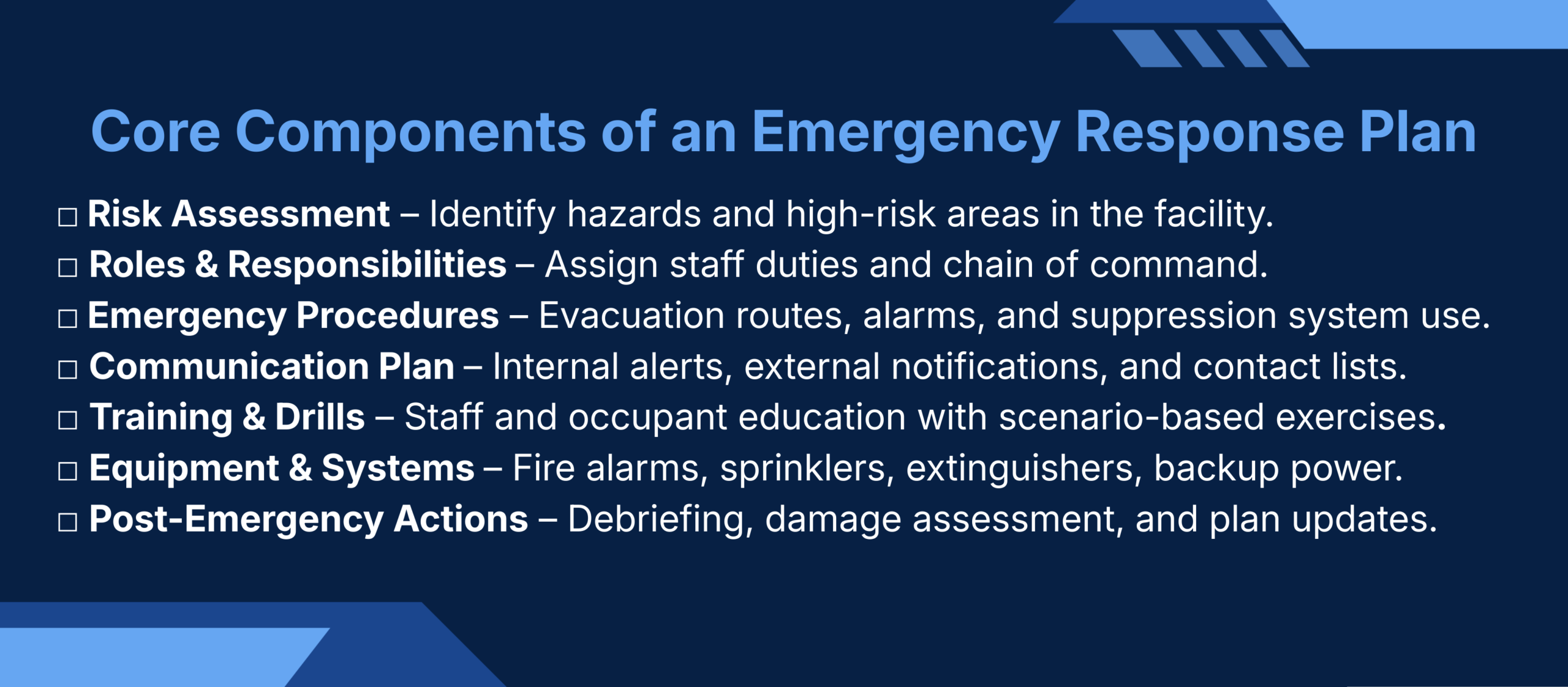 National Fire & Safety provides ongoing guidance on changes to safety standards, helping facilities adapt their emergency plans and systems accordingly. Regularly reviewing reports, attending webinars, and participating in regional preparedness forums can also keep your team knowledgeable and ready.